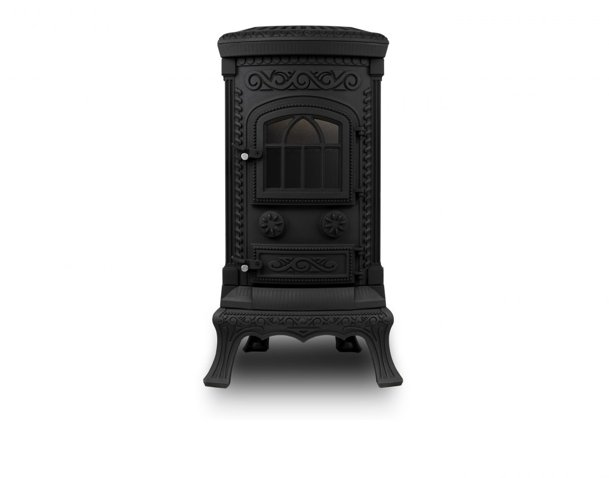 Menší litinová krbová kamna PLATO (černé) v elegantním rustikálním stylu. Kamna mají celolitinové topeniště, litinový rošt, popelník pod roštem, systém čištění skla vzduchem, primární a sekundární regulátor. Kamna představují ideální poměr ceny a kvality – doporučujeme!
